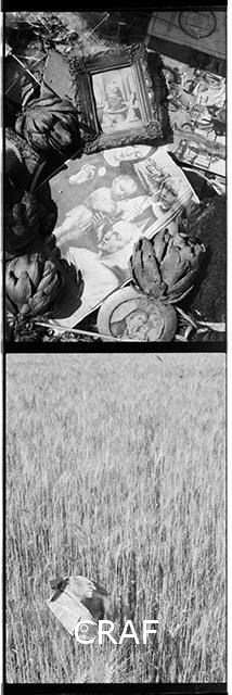 Composizione di immagini sacre, di cui due incorniciate, adagiate sul terreno assieme ad alcune teste di carciofo. Lo scatto fa parte della serie “Tracce”.