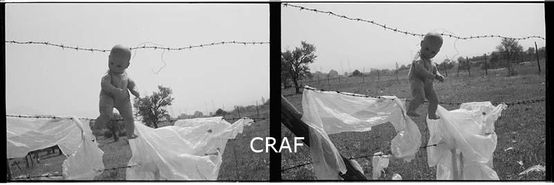 Particolare di una vecchia bambola che penzola da una recinzione in filo spinato, in un'area rurale. Lo scatto fa parte della serie “Tracce”.