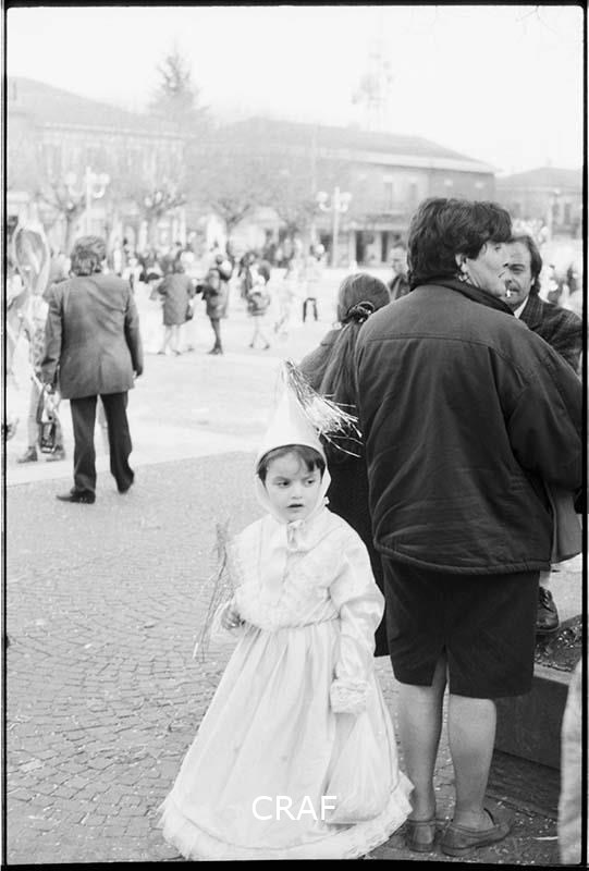 Bambina in maschera con un costume da fatina durante i festeggiamenti del Carnevale di Avezzano. Alle sue spalle si vedono alcuni adulti.
