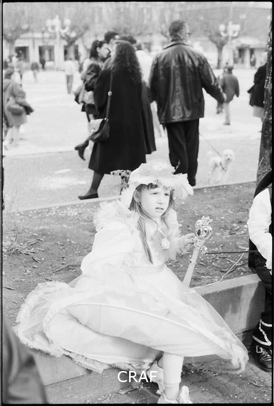 Bambina in maschera seduta sul cordolo di un'aiuola durante i festeggiamenti del Carnevale di Avezzano. Alle sue spalle si vedono diversi adulti e un cane.