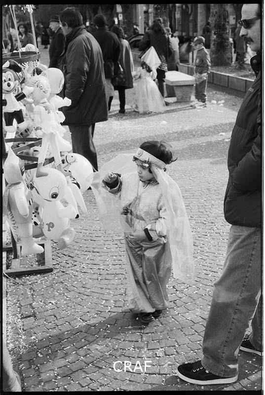 Bambina in maschera davanti alla bancarella di un venditore di palloncini durante i festeggiamenti del Carnevale di Avezzano.