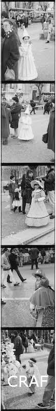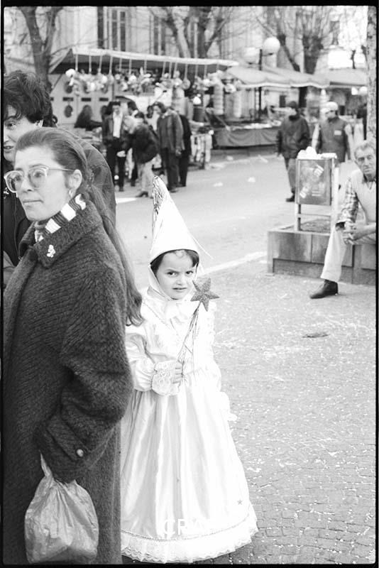 Bambina in maschera con un costume da fatina durante i festeggiamenti del Carnevale di Avezzano. Sulla sinistra si vedono due donne, sullo sfondo alcune bancarelle.