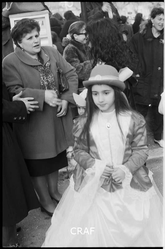 Bambina vestita in maschera in mezzo alla folla durante i festeggiamenti del Carnevale di Avezzano.