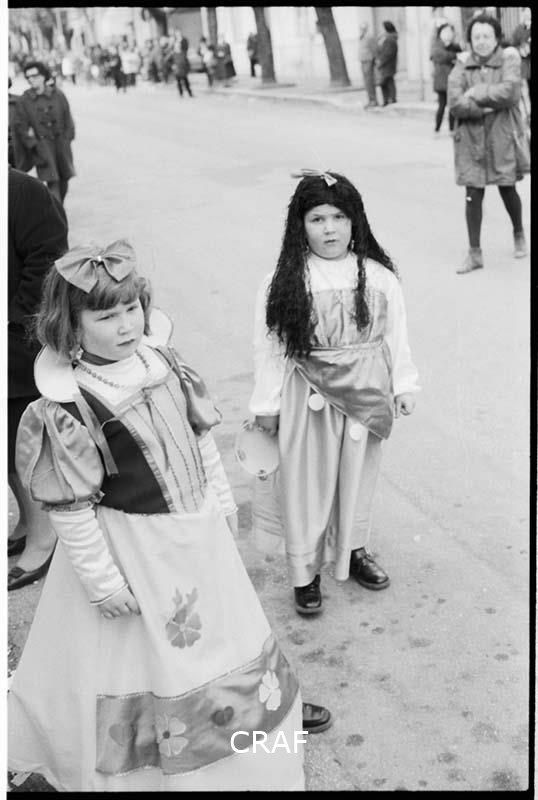 Due bambine in maschera riprese per strada durante i festeggiamenti del Carnevale di Avezzano. Alle loro spalle si vedono numerosi passanti.