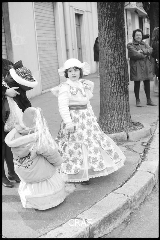Bambina in maschera ferma sul marciapiede durante i festeggiamenti del Carnevale di Avezzano. Sulla sinistra, di schiena, un'altra bambina più piccola che indossa un giubbotto pesante sopra al costume carnevalesco.
