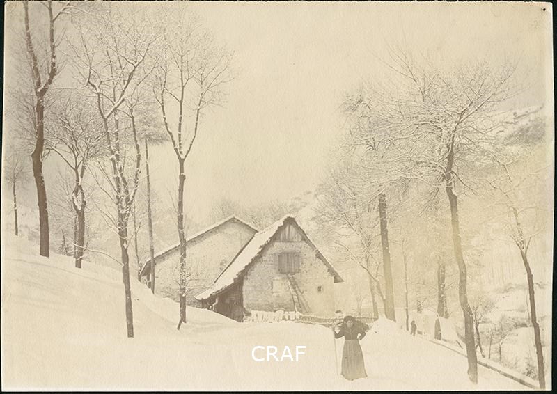 Veduta invernale presso Barcis: davanti a casa una donna cammina nella neve aiutandosi con un bastone.