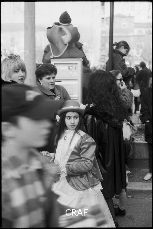 Bambina in maschera ripresa in mezzo alla folla durante i festeggiamenti del Carnevale di Avezzano.
