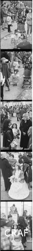La folla accorsa in città in occasione dei festeggiamenti del Carnevale di Avezzano. In primo piano si vede una bambina vestita in maschera e alle sue spalle una donna che spinge un passeggino.