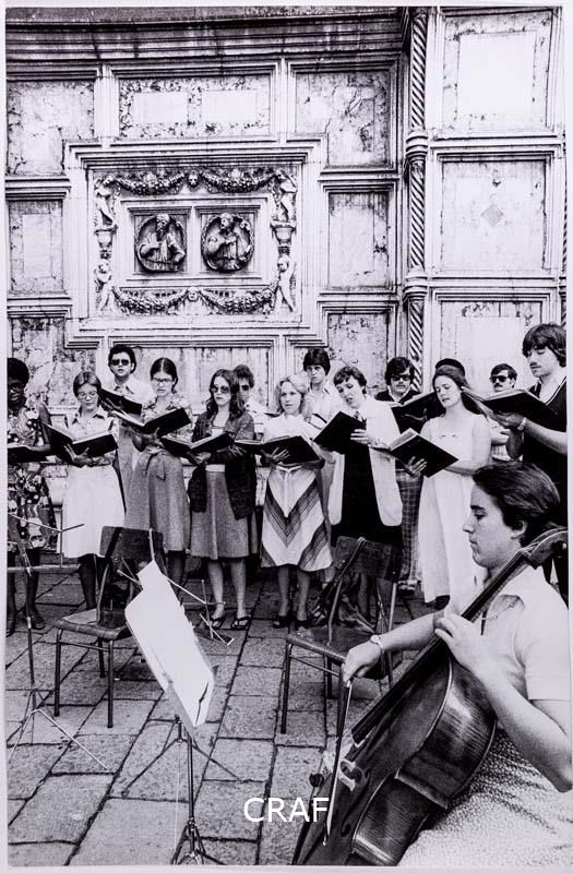 Concerto sul sagrato della chiesa di S. Zaccaria. Didascalia riportata sotto all'immagine pubblicata nel volume Venezia TCI del 1978 (immagine n. 156, pag. 199).