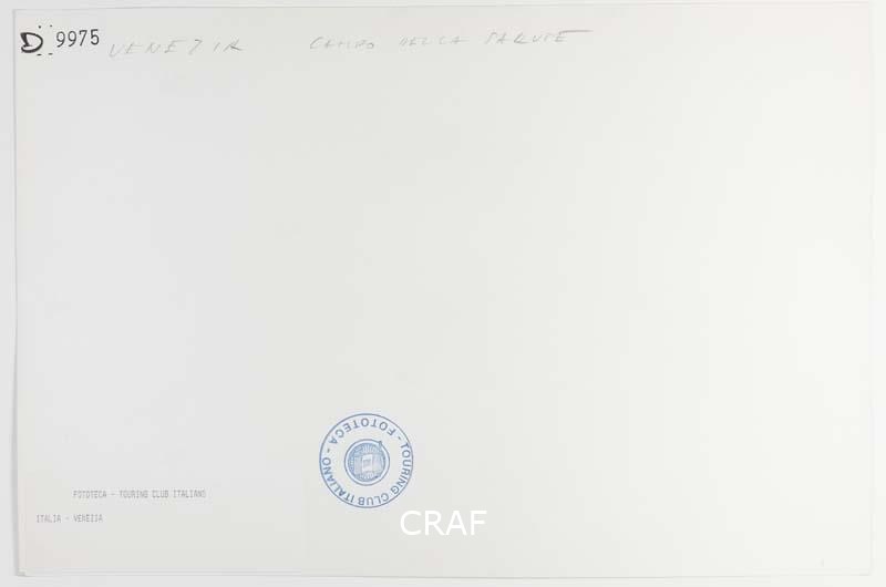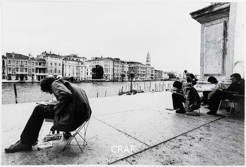 Un gruppo di giovani intenti a disegnare dal vero davanti all'ingresso della basilica della Salute. Scatto realizzato in occasione della campagna fotografica per il volume Venezia TCI del 1978, ma non pubblicato.