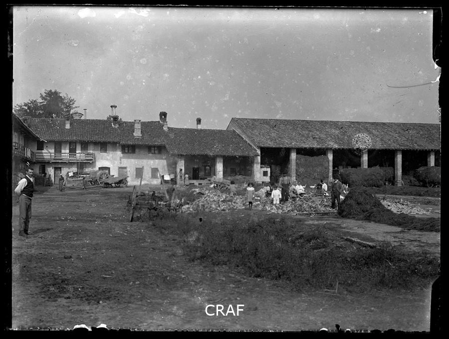 Cortile di una casa di campagna con bambini, uomini e donne