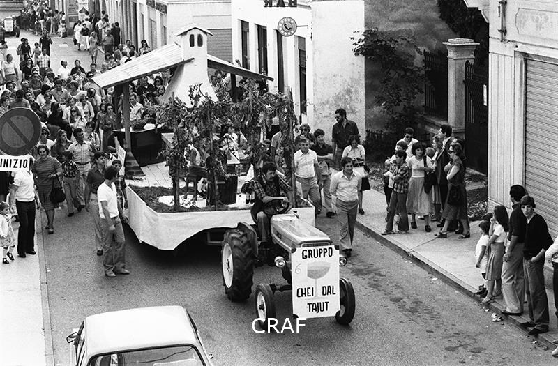Veduta di una via dell'abitato di Cormons durante la tradizionale Festa dell'Uva che si svolge a settembre; nella via del paese sfila un carro allegorico trainato da un trattore