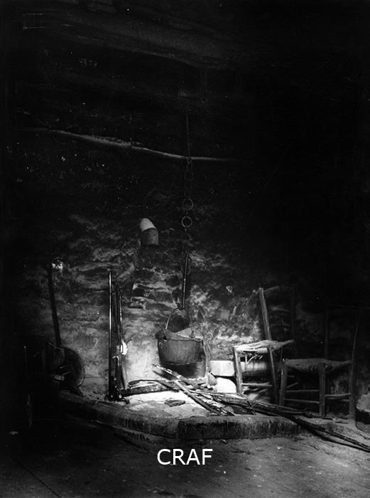 Immagine di un tipico focolare friulano, posizionato sul pavimento; si intravede la parete completamente ricoperta di fuliggine e un paio di sedie attorno al focolare