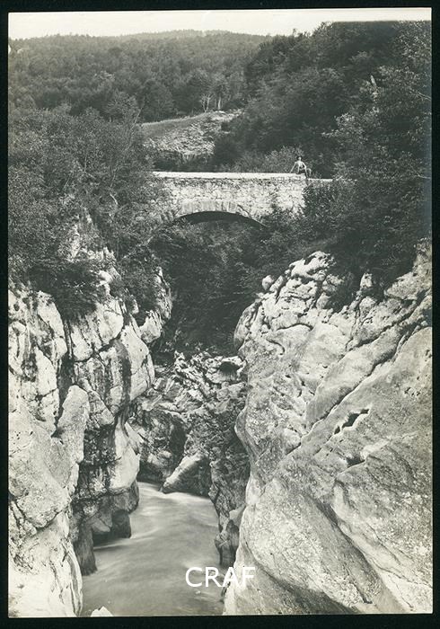 Veduta della Forra del Cellina, presso Vallata (Barcis). Un uomo è seduto sulla destra del ponte Busèt che la attraversa.
