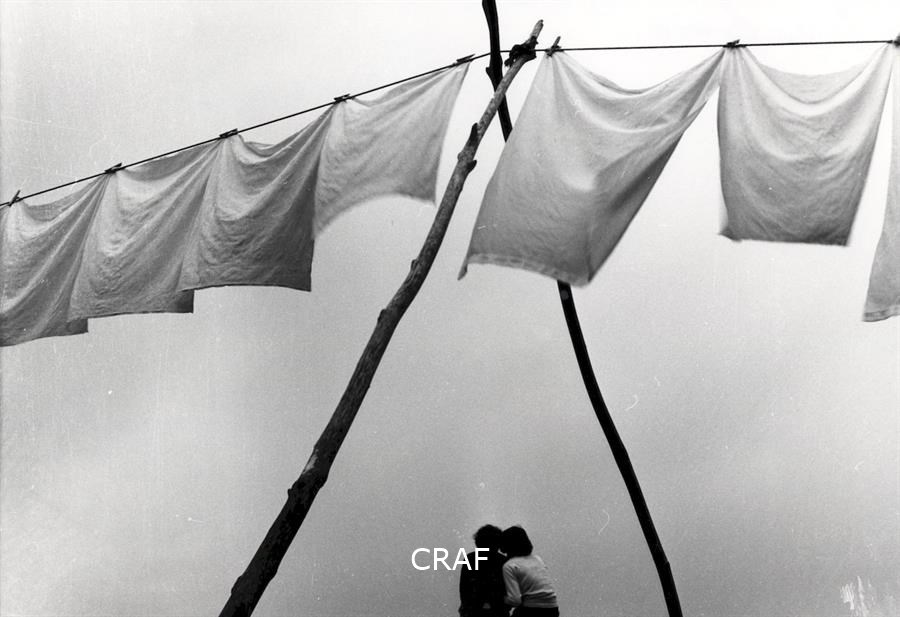 Una coppia di fidanzati si abbraccia sotto una fila di panni stesi