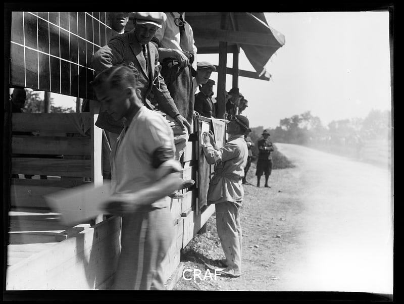 Ripresa della tribuna con il tabellone dei punteggi durante il terzo Circuito motociclistico di Valvasone.