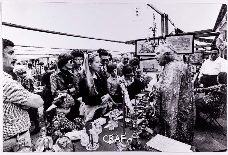Il mercato dell'antiquariato il giorno della Sensa in Campo S. Maurizio. Didascalia riportata sotto all'immagine pubblicata nel volume Venezia TCI del 1978 (immagine n. 119, pag. 166). Il mercato si tiene in occasione della festività dell’Ascensione ("Sensa" in dialetto veneziano).