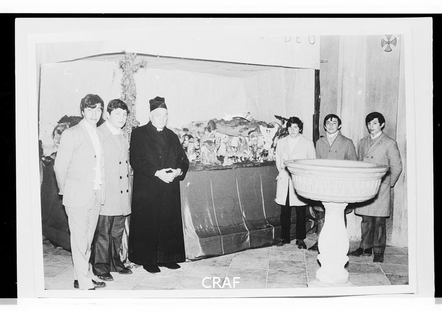 Ritratto di gruppo all'interno della Chiesa di San Giacomo Apostolo accanto al Presepe natalizio, da sinistra Salvador Franco, Cristofoli Adriano, Don Missana Pietro, Scodeller Walter e i fratelli Tonello Alessio e Tonello Armando