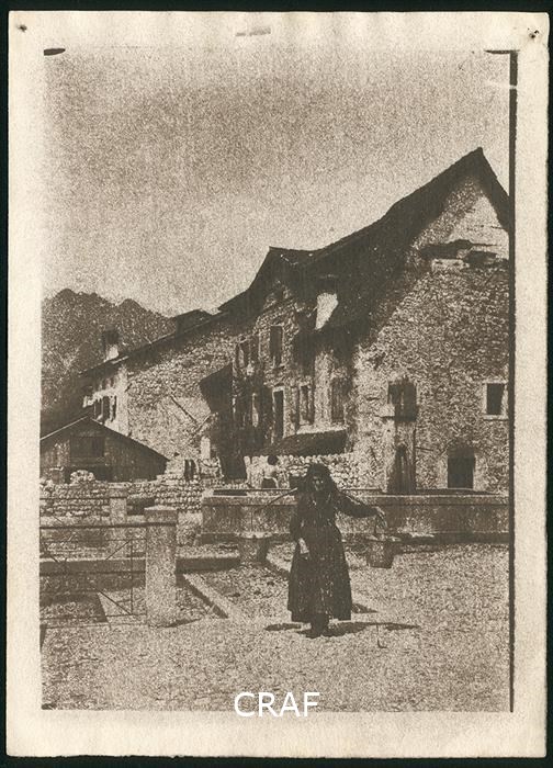 A Barcis, in piazza Vittorio Emanuele II (di fronte all'allora municipio) un signora anziana trasporta due secchi d'acqua con un bilanciere da spalla attinta dalla fontana alle sue spalle.