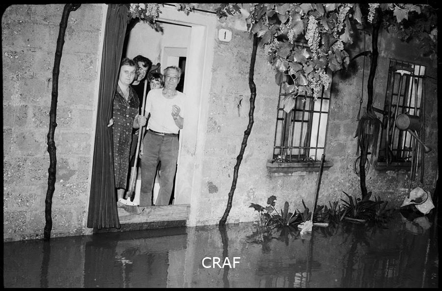 Ritratto di una famiglia sul ciglio della porta d'ingresso della casa; l'immagine è ripresa in notturna e la famiglia viene ritratta all'interno della casa mentre all'esterno la strada è completamente allagata; sulla porta d'ingresso uno sbarramento in legno e il signor Antonio Ros con la scopa in mano pronto per ripulire casa da acqua e fango