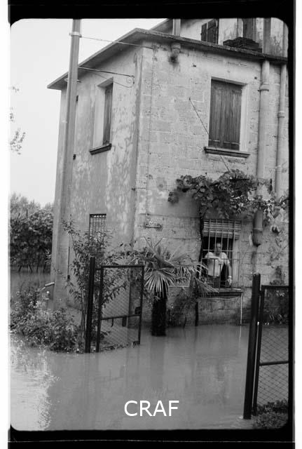 Ritratto di Antonio Ros "imprigionato" tra le inferriate della finestra di casa sua nell'attesa che l'acqua, straripata dal fiume dopo l'alluvione, scenda