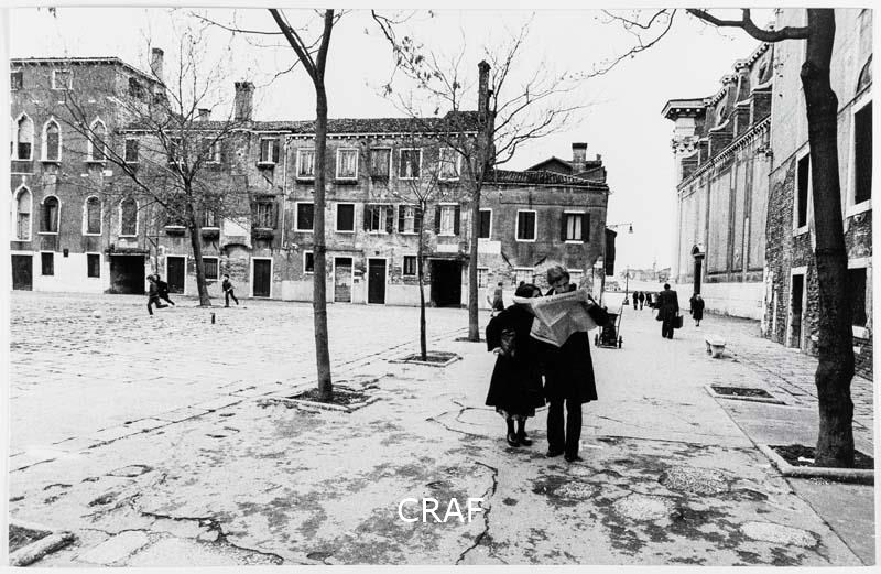 Due giovani intenti a leggere il Gazzettino in campo Sant'Agnese, nei dintorni delle Zattere. Scatto realizzato in occasione della campagna fotografica per il volume Venezia TCI del 1978, ma non pubblicato.