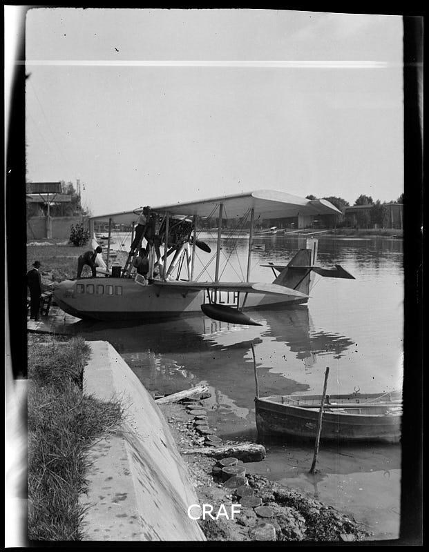 Ripresa di un idrovolante Cant 10 di Cantieri Aeronautici Navali Triestini ammarato a Venezia, scalo aereo del primo volo di linea italiano: la tratta Torino-Trieste, inaugurata dalla Società Italiana Servizi Aerei (S.I.S.A.) il 1° aprile 1926 decollando da Torino, dal Po al Parco del Valentino, e da Trieste (Portorose).