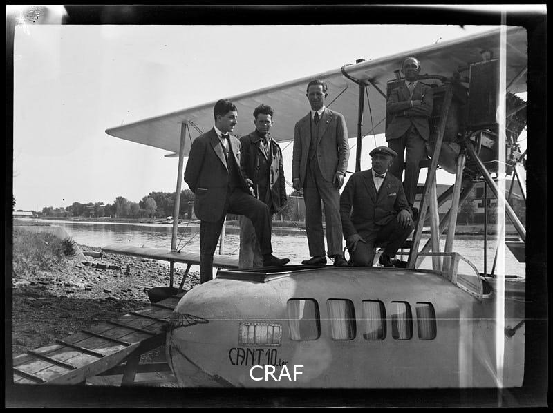 Ritratto di gruppo su un idrovolante Cant 10 di Cantieri Aeronautici Navali Triestini ammarato a Venezia, scalo aereo del primo volo di linea italiano: la tratta Torino-Trieste, inaugurata dalla Società Italiana Servizi Aerei (S.I.S.A.) il 1° aprile 1926 decollando da Torino, dal Po al Parco del Valentino, e da Trieste (Portorose).