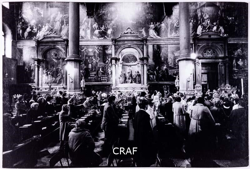 L'interno di San Zaccaria con la pala del Bellini e le grandi tele ripristinate dai recenti restauri. Didascalia riportata sotto all'immagine pubblicata nel volume Venezia TCI del 1978 (immagine n. 150, pagg. 194-195).