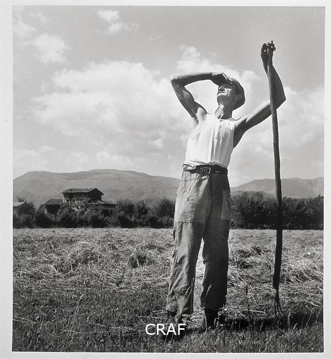 Un contadino scruta il cielo appoggiato alla sua forca