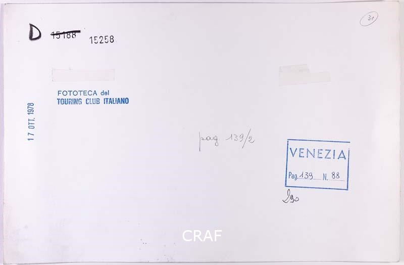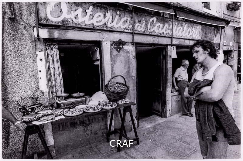 Osteria sulla fondamenta dei Vetrai a Murano. Didascalia riportata sotto all'immagine pubblicata nel volume Venezia TCI del 1978 (immagine n. 88, pag. 139). Aperta negli anni '50, l'Osteria ai Cacciatori è tutt'ora uno dei luoghi di ritrovo privilegiati dai muranesi.