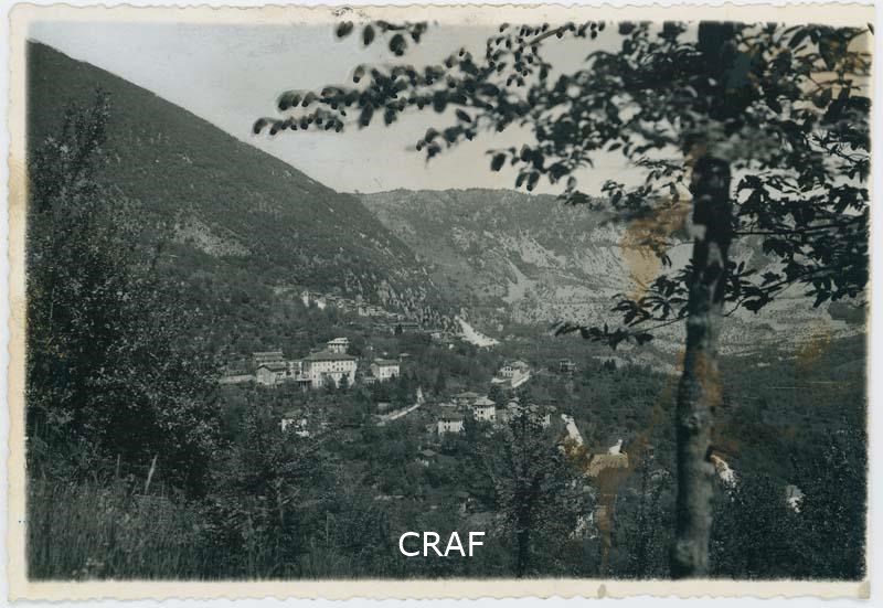 Veduta delle prime case di Anduins riprese da un bosco limitrofo e leggermente...