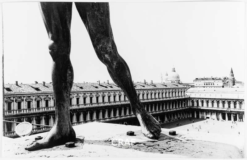 Particolare di una delle statue dei Mori sulla Torre dell'Orologio in Piazza San Marco. Sullo sfondo si riconoscono le Procuratie Nuove e l'Ala Napoleonica. Scatto realizzato nell'ambito di una delle campagne fotografiche commissionate dal TCI, ma non pubblicato.