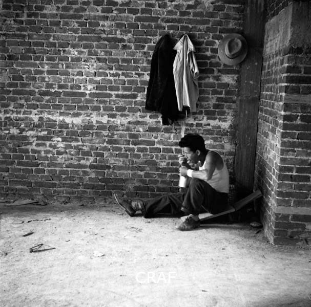 Pausa pranzo di un muratore durante la costruzione delle scuole medie inferiori di Spilimbergo