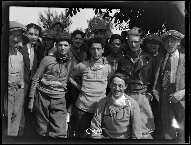 Ritratto di un gruppo di piloti della Casa motociclistica G.D durante il primo Circuito motociclistico di Valvasone (categoria 125 cm). Il primo a sinistra è Omobono Tenni.