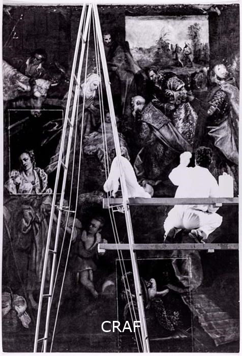Restauratore all'opera nel laboratorio di S. Gregorio. Didascalia riportata sotto all'immagine pubblicata nel volume Venezia TCI del 1978 (immagine n. 149, pag. 193). L'ex chiesa di S. Gregorio, a pochi passi dalla basilica della Salute, fu adibita a laboratorio di restauro della Soprintendenza tra gli anni '60 e '90.