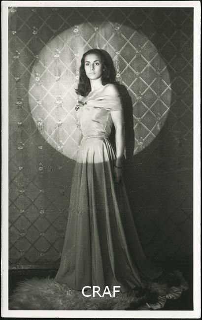 Ritratto di una giovane donna in abito lungo il cui busto risulta al centro di un cerchio di luce.