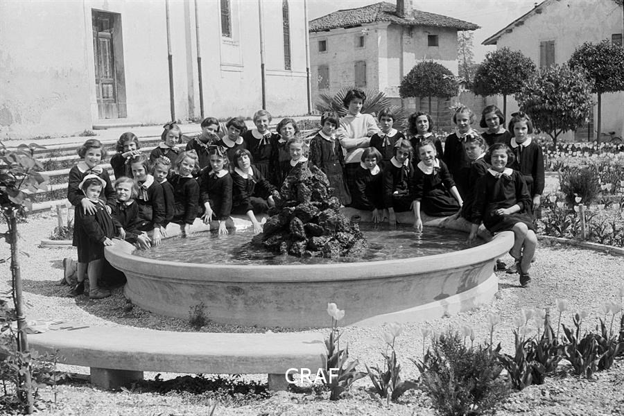 Ritratto di un gruppo di ragazze sedute attorno ad una fontana nella piazza di Bagnarola; si possono riconoscere l'insegnante Coassin Ernestina e le alunne: Zamparo Emanuela, Nimis M. Teresa, Ridolfi Natalia, Giacomello Antonietta, Rumiel Marina, Bortolussi Ernestina, Bortolus Domenica, Infanti Rosanna, Zamparo Maurizia, Nosella Nadia, Jus Marisa, Tussut Antonietta, Zorzi Luigina, Del Bianco Bianca, Piagno Bruna, Grotto Carmen, Odorico Giuliana, Bortolussi Iole, Milan Giuseppina, Antoniali Franca, Trolese Clara, Zamparo Maria, Del Frari Lucia, Fontanel Paola, Dazzan Emilia, Argenton Luciana