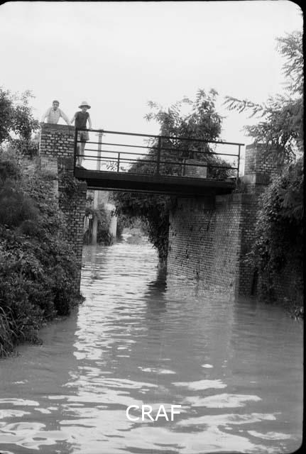 Ritratto di due ragazzi, Renzo Daneluzzi porta un cappello in testa, sopra un piccolo ponte; sotto al ponte una strada completamente allagata