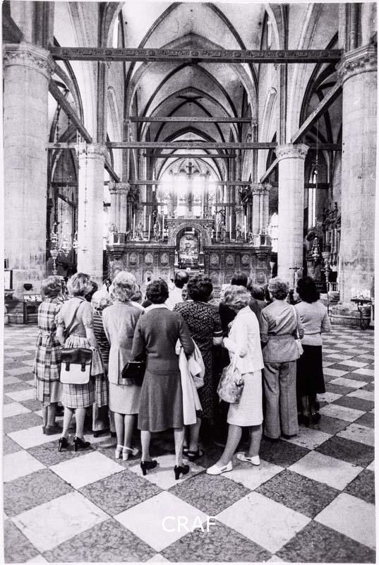Un gruppo di donne ammira gli interni della basilica di Santa Maria Gloriosa dei Frari. Scatto realizzato in occasione della campagna fotografica per il volume Abbazie e conventi TCI del 1973, ma in quell’occasione non pubblicato.