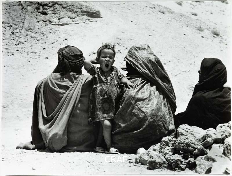 Famiglia marocchina seduta a terra con una bambina intenta a sbadigliare