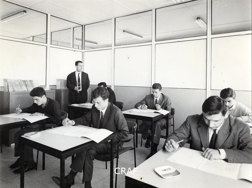 Veduta interna dello stabilimento Zanussi. Un gruppo di giovani partecipa alle prove collettive di selezione del personale. Ciascun banco dell'aula è dotato di posacenere Zanussi