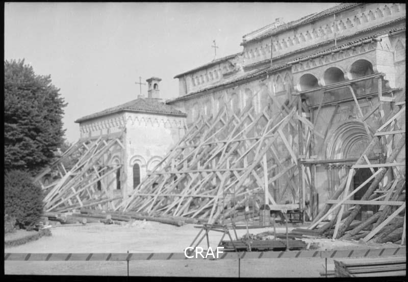 Veduta laterale del Duomo di Santa Maria Maggiore sostenuto da complesse impalcature lignee.