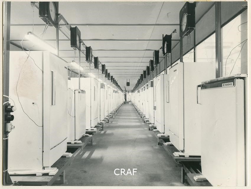 Veduta interna dello stabilimento Zanussi: reparto di montaggio frigoriferi. In primo piano un frigorifero modello Naonis, in lontananza un operaio al lavoro