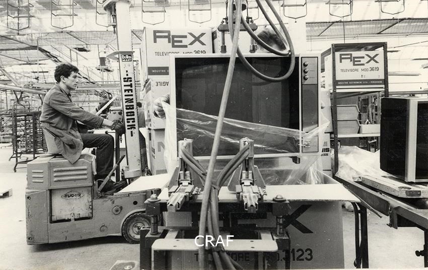 Veduta interna dello stabilimento Zanussi. Un operaio addetto alla linea imballo, solleva alcuni scatoloni contenenti televisori REX