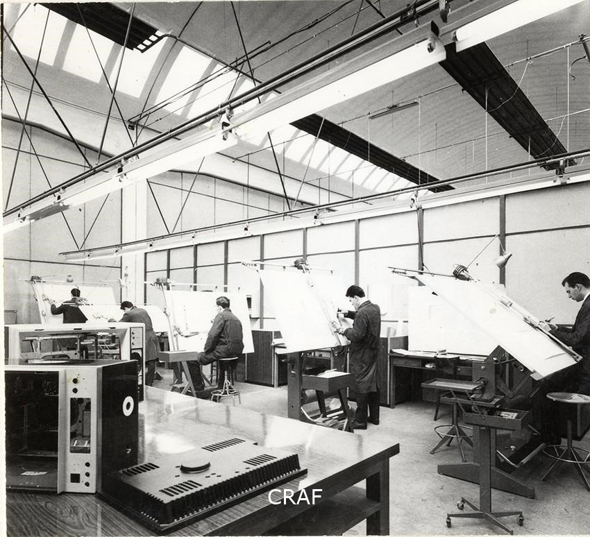 Veduta interna della sala disegnatori presso lo stabilimento Zanussi. Alcuni designers lavorano presso il loro tavolo da disegno