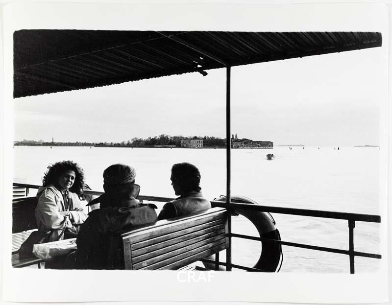 Passeggeri su un vaporetto, alle loro spalle in lontananza l'isola di San Servolo. Scatto realizzato in occasione della campagna fotografica per il volume Venezia TCI del 1978, ma non pubblicato.