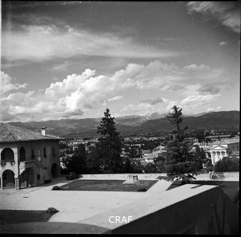 Veduta del piazzale del Castello scattata dalla sommità della doppia scalinata d'ingresso. A sinistra si intravede la Casa della Contadinanza. Sullo sfondo le prealpi e le alpi Giulie.