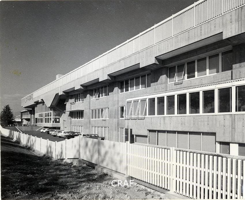 Veduta esterna dell'edificio per uffici progettato dall'architetto Gino Valle per lo stabilimento Zanussi. Si distinguono il parcheggio per dipendenti e la struttura aggettante in cemento armato dell'ultimo livello