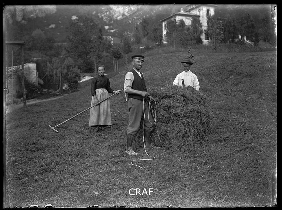 Donna e uomini al lavoro nei campi sulle colline di Ballabio